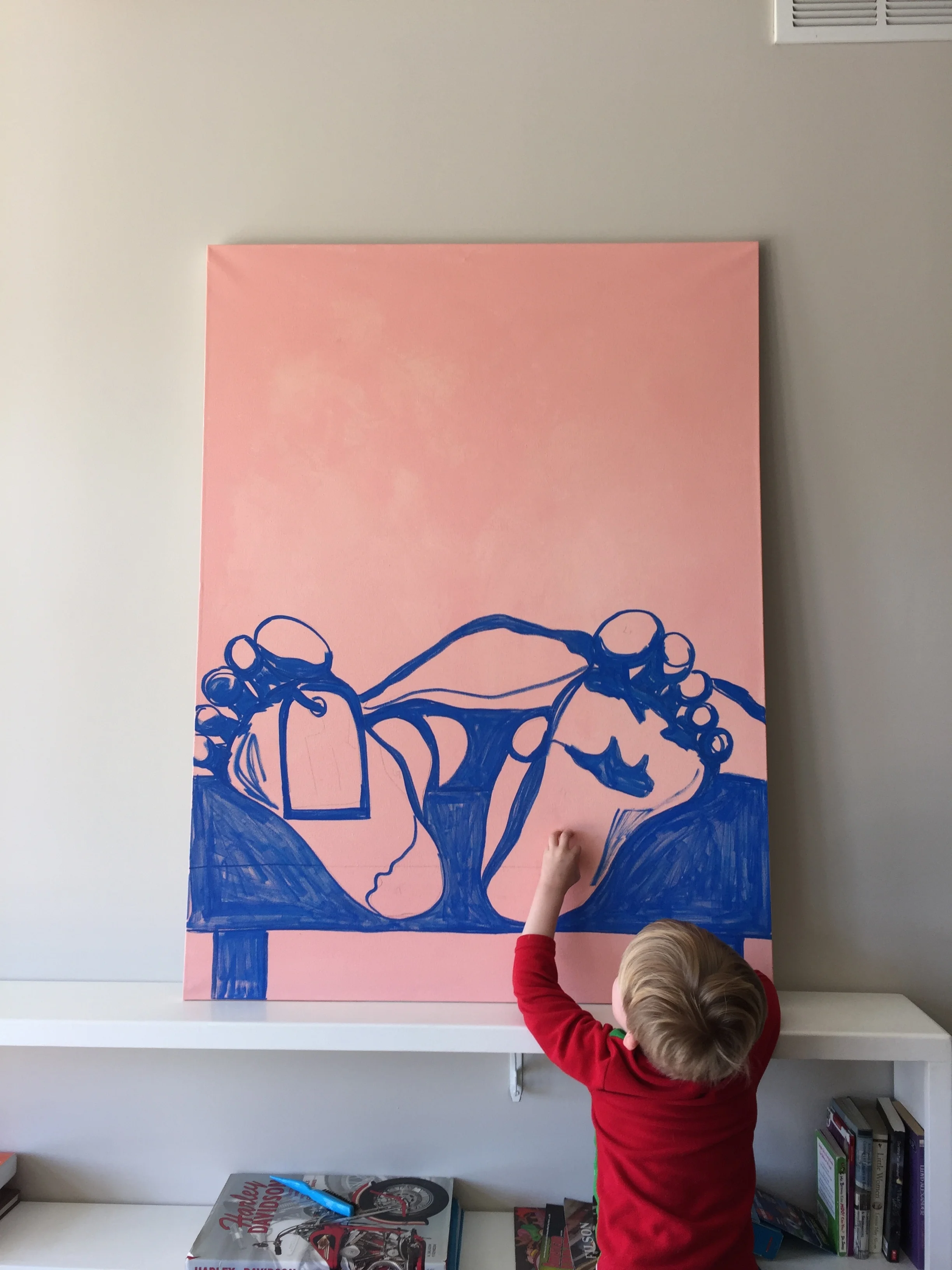 Around 9 am, everyone was gone but our little guy, who is four. He decided that because it's cold outside today, that he would dress up like an elf. He put his striped pjs on and a Santa hat, then colored printed out Santa pictures from the internet pretty much all morning, which allowed me some time at the kitchen island with my paints, acrylic paint pens, and a a 36x48 canvas.
