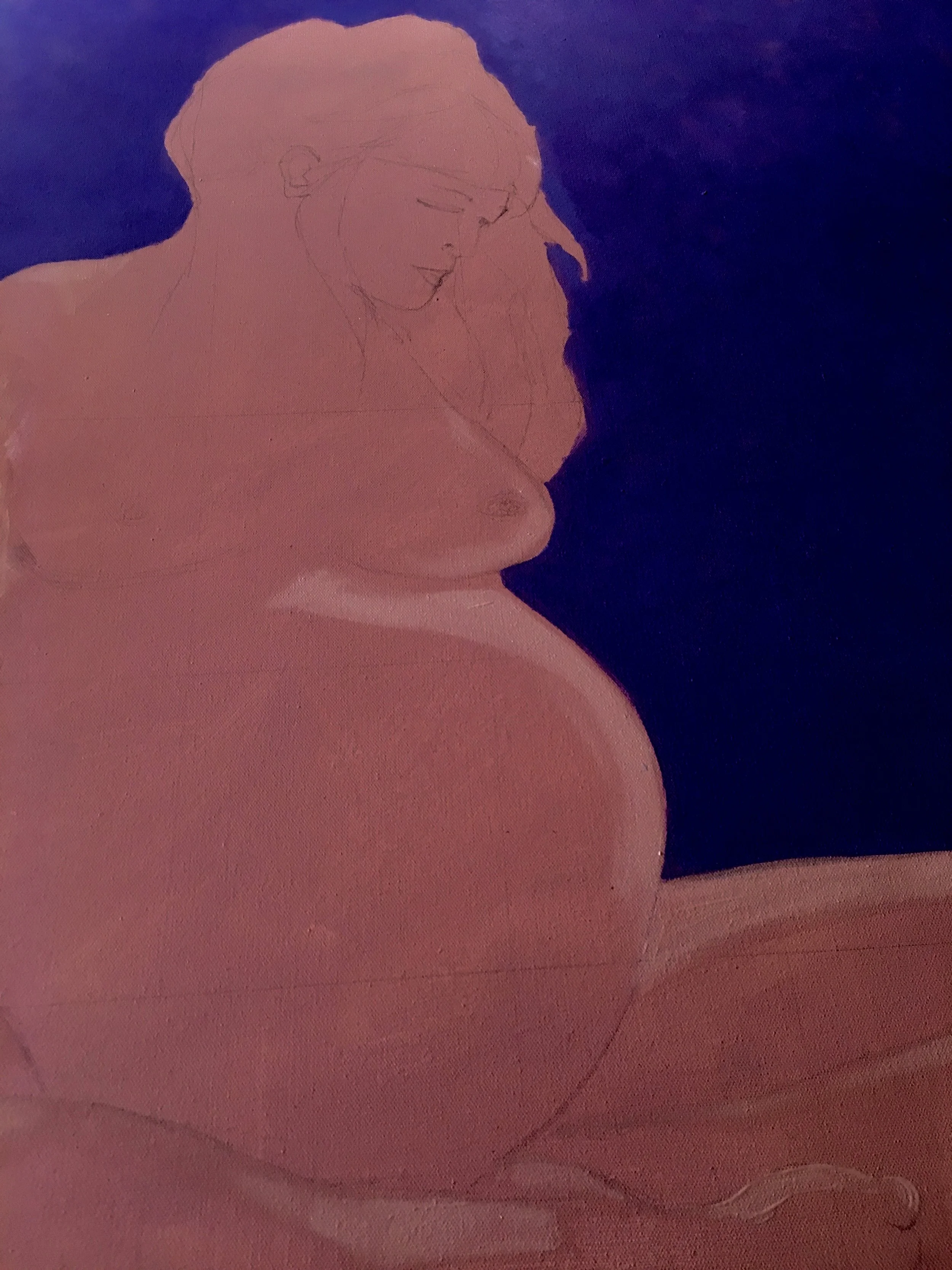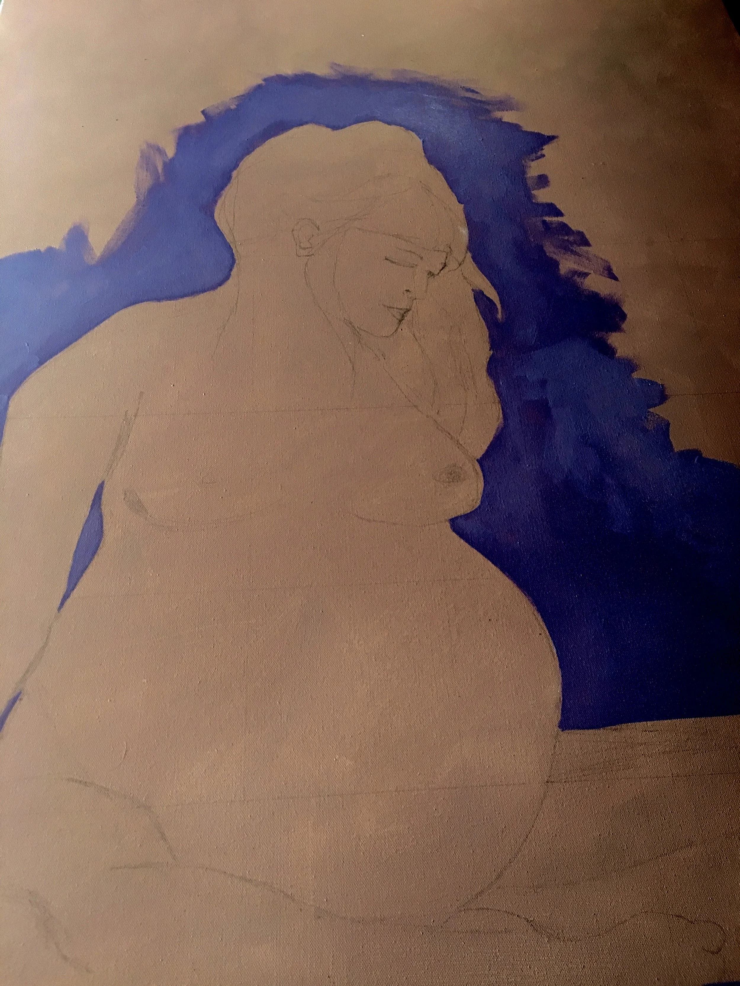 Very light sketch with pencil over canvas prepped with a color I mixed to match "The Bathers" flesh hue.